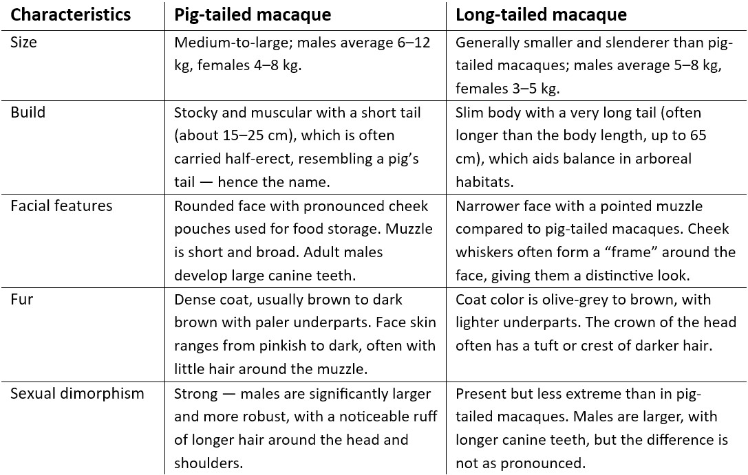 As the name suggests, the pig‑tailed macaque has a short tail that curves upward (like a pig’s tail), while the long‑tailed macaque has a significantly longer tail. Another key difference is their body size: Pig‑tailed macaques weigh between 5–15 kg and have buff-brown coats with darker backs, whereas long‑tailed macaques are typically smaller and slenderer. Recognizing these features makes field identification and monitoring much more reliable.