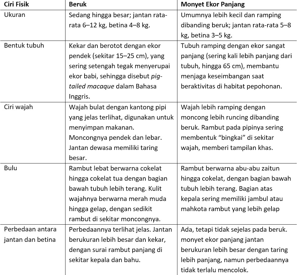 Sesuai dengan namanya, beruk (pig-tailed macaque dalam Bahasa Inggris) memiliki ekor pendek yang melengkung ke atas seperti ekor babi, sedangkan monyet ekor panjang memiliki ekor yang jauh lebih panjang. Perbedaan mencolok lainnya terletak pada ukuran tubuhnya. Beruk memiliki berat antara 5–15 kilogram dengan bulu berwarna cokelat kekuningan dan punggung yang lebih gelap, sementara monyet ekor panjang umumnya berukuran lebih kecil dan bertubuh lebih ramping. Mengenali ciri fisik ini membuat proses identifikasi dan pemantauan di lapangan menjadi lebih akurat.